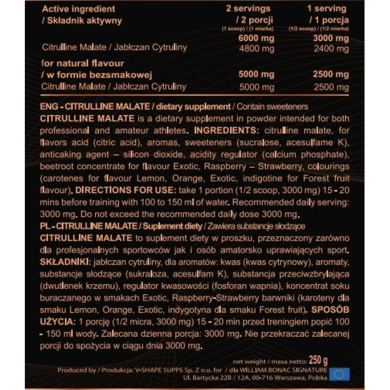 William Bonac The Legend Series Citrulline Malate is a high-quality performance supplement designed to support muscle pumps, endurance, and nitric oxide production during training. Citrulline malate helps increase blood flow, reduce muscle fatigue, and support sustained workout performance.